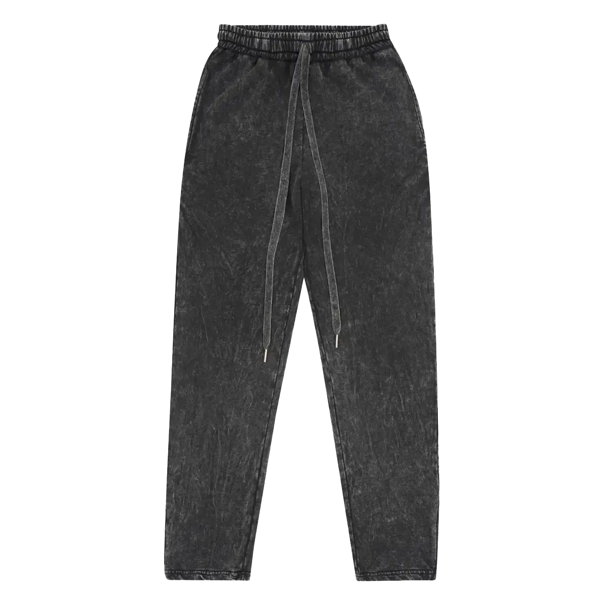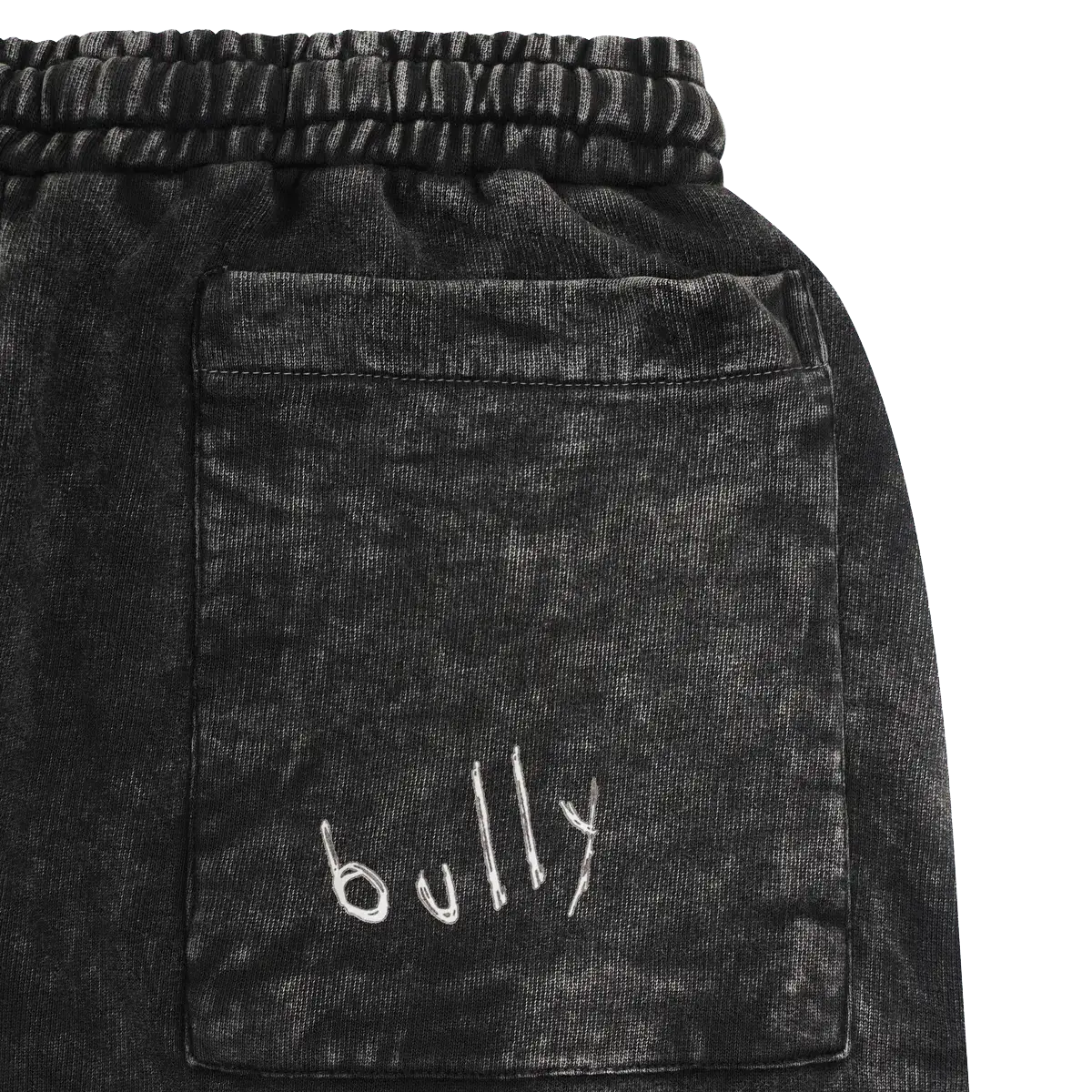 Charcoal wash sweatpants with a stone-faded surface, extra-long drawstrings, YKK metal zip-downs at the hems and a BULLY graphic on the back pocket. Loose, straight leg fit that sits on the hips and stacks slightly over shoes when worn at full length.