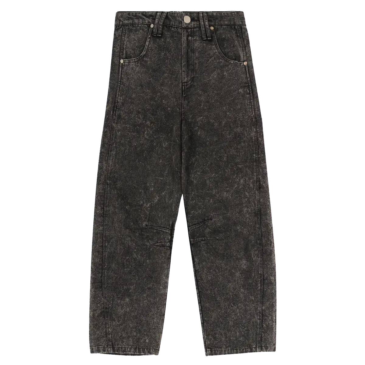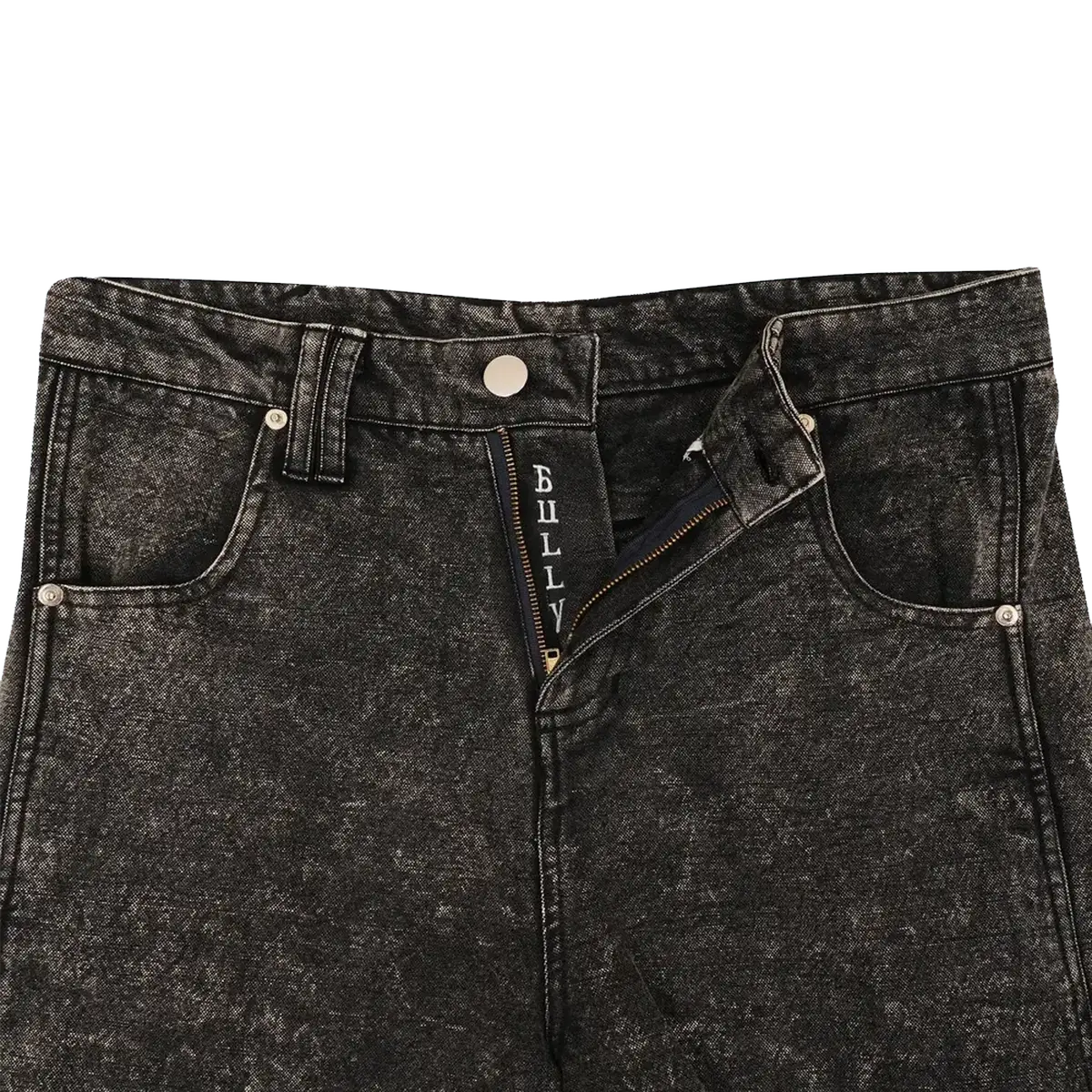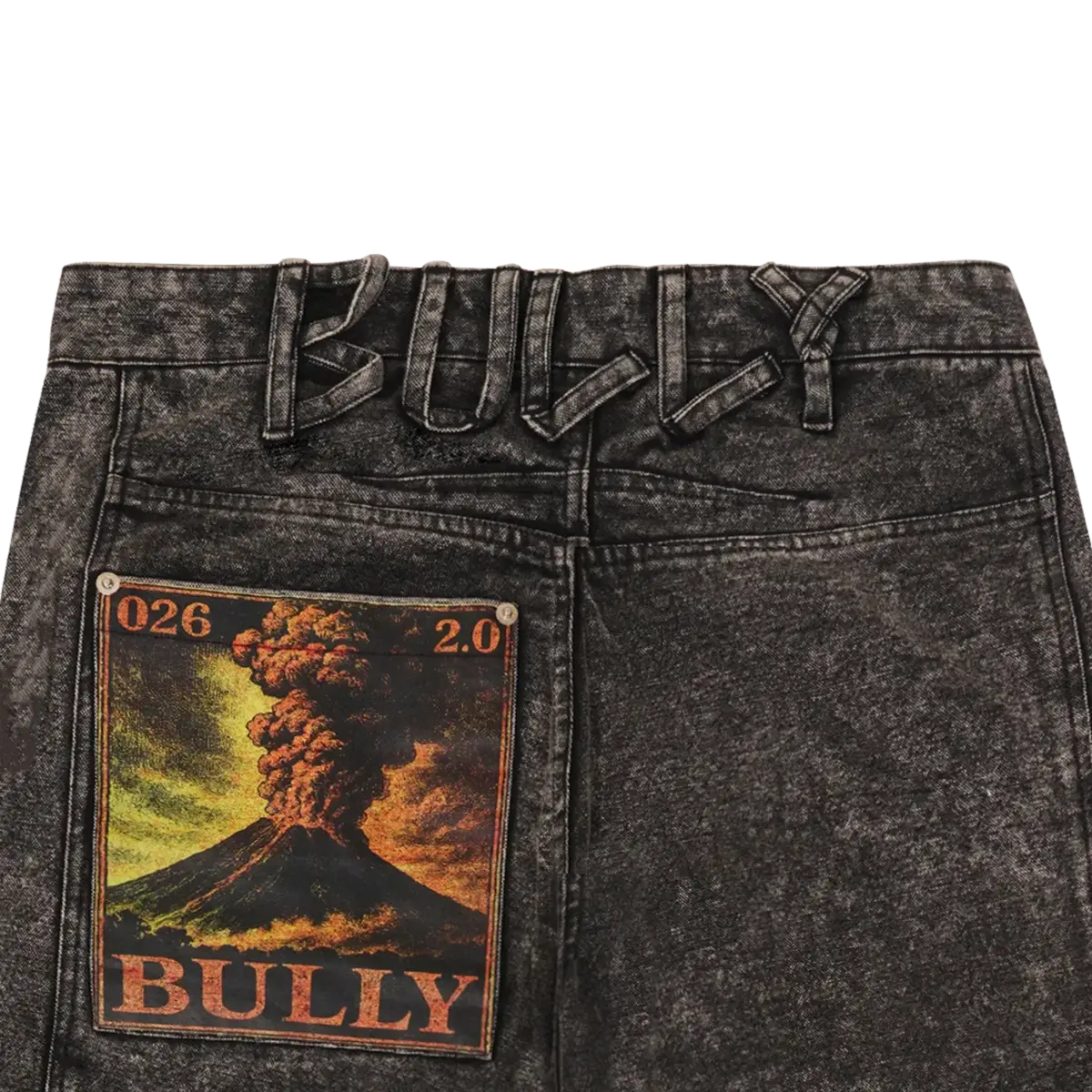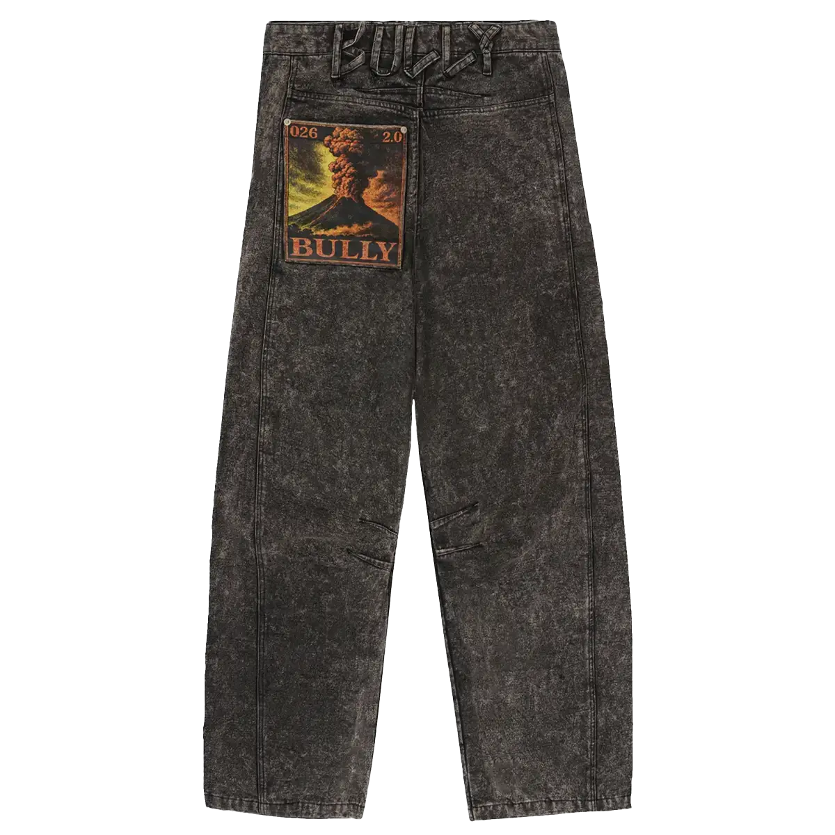Black dusted denim trousers with a balloon silhouette, hand-finished acid wash texture, custom BULLY belt loops, embroidered fly-zipper detailing with a printed volcano stamp graphic at the back pocket. High-rise waist with a wide leg cut that tapers softly at the hem.