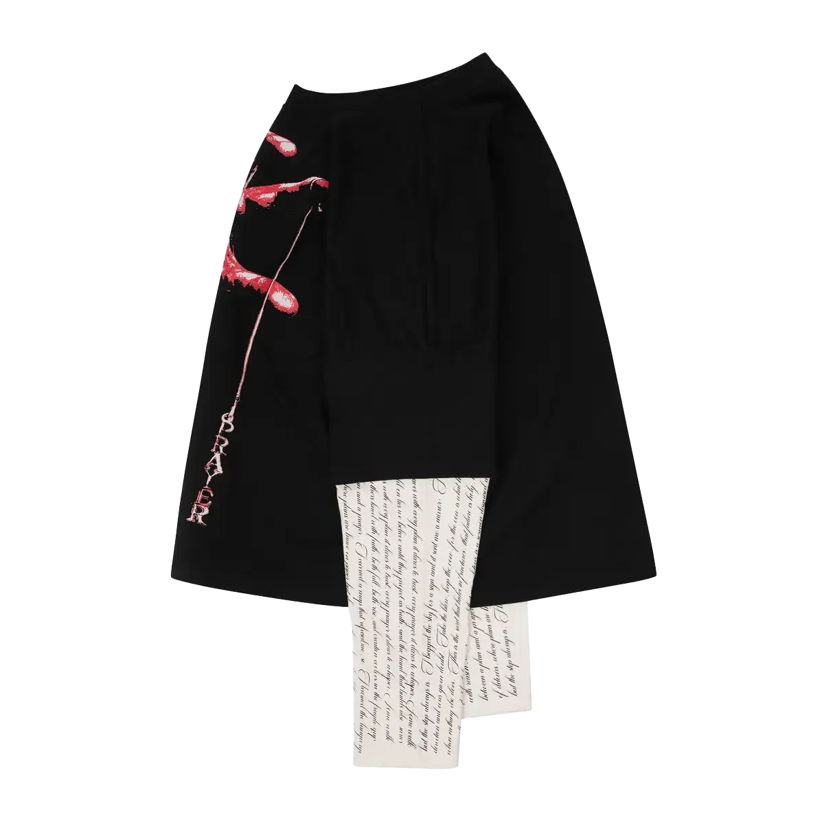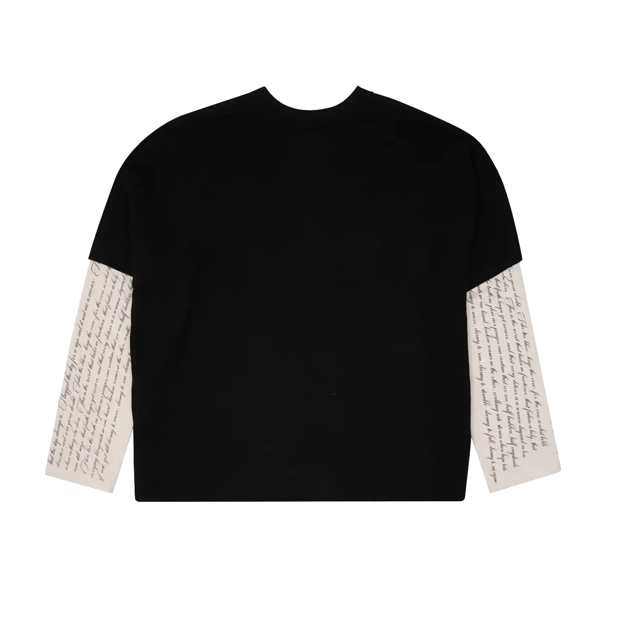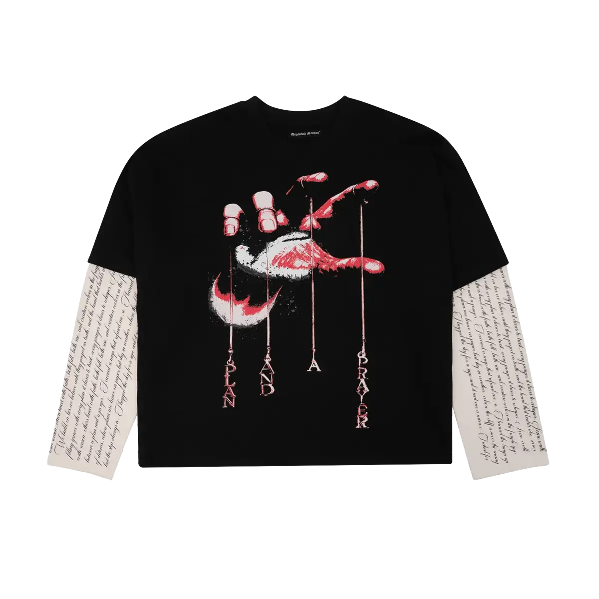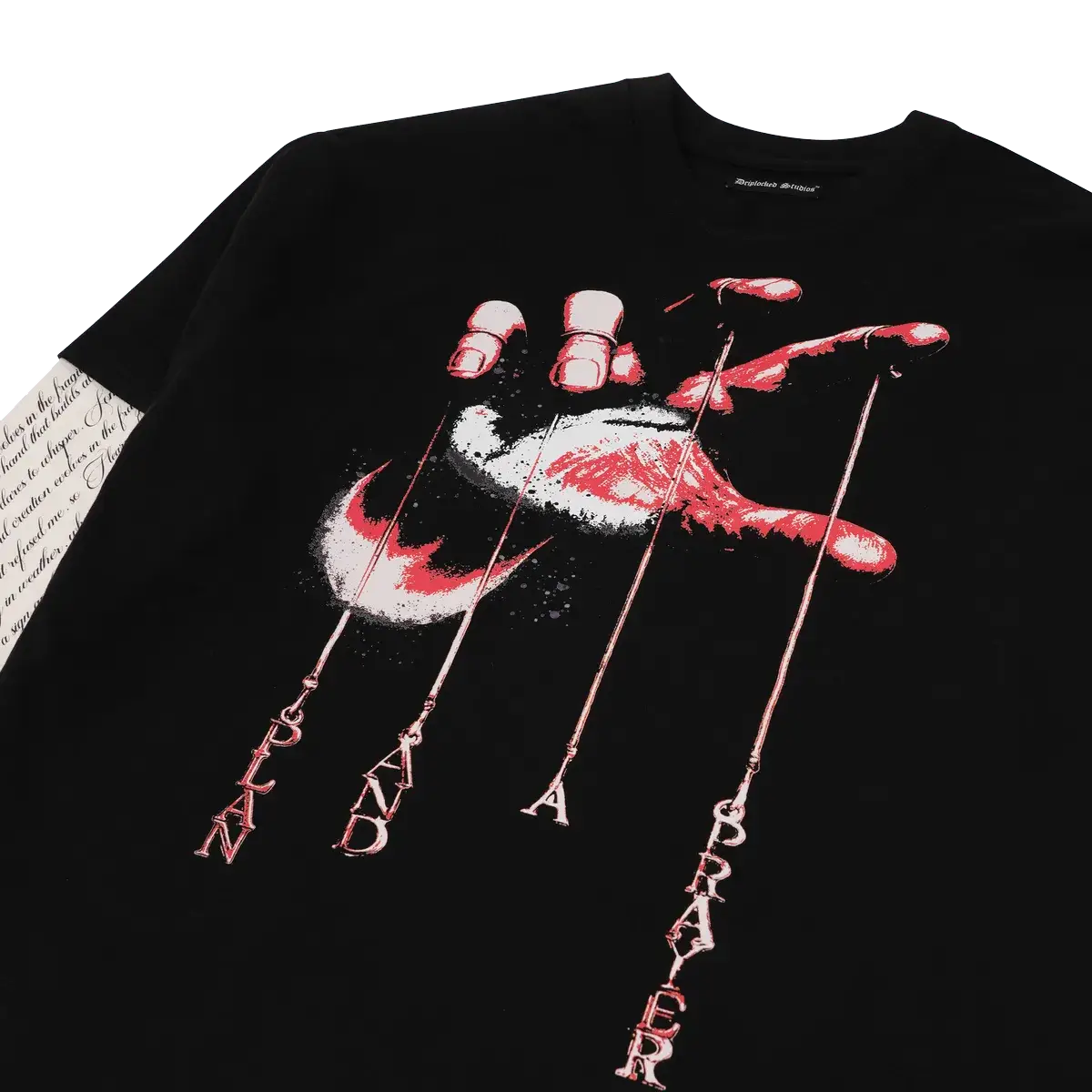 Black graphic tee with built-in layered sleeves and a puppet-hand motif across the chest. Heavyweight-cotton base with inner sleeves printed in script.